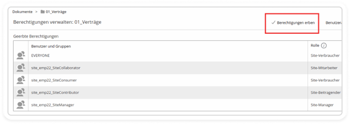 Example: On Emma Schneider’s profile, the “Contracts” folder is visible only to authorized users from specific groups.
